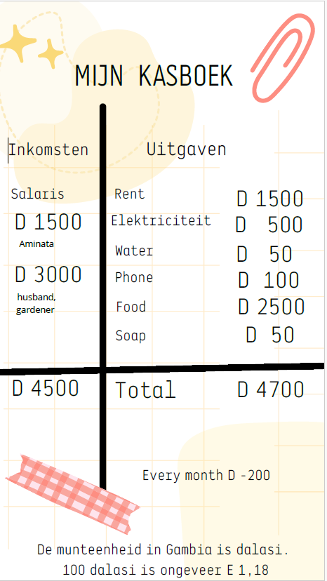 We drukken haar op het hart om dan toch vooral veel te rusten en om 2 maal daags een theelepel moringapoeder te nemen om de bloeddruk omlaag te krijgen. We geven haar een zakje mee. Hoofdschuddend pakt ze het zakje aan. “Denk je dat ik tijd heb om te rusten? Met drie kleintjes om me heen? Ik moet koken voor mijn gezin, voor mijn invalide schoonmoeder zorgen, kleding wassen, de compound vegen en als dat dan allemaal gebeurd is, loop ik naar de hoofdweg om een busje te nemen naar Tranquil of naar Brufut Heights. Dat zijn de wijken waar mensen met geld wonen. Ik ga daar langs de deuren om producten te verkopen. Shampoo, bodymilk, ataya. Het meeste geld is voor mijn baas, maar als ik heel goed mijn best doe, houd ik daar na aftrek van transportkosten zo’n 100 dalas per keer aan overi. Pfff… ik moet zoveel. Rusten? Ik ben blij als ik ’s nachts een paar uur kan slapen!”